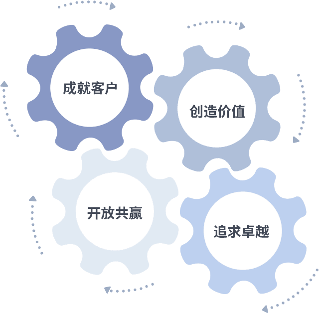 成就客户是一切决策的出发点,,,创造价值是衡量所有工作的标准,,,,追求卓越是我们做事做人的态度,,开放共赢是我们的格局也是最终的结果。。。价值观的齿轮环环相扣,,,,推动着组织里的每个人不断向前。。。。